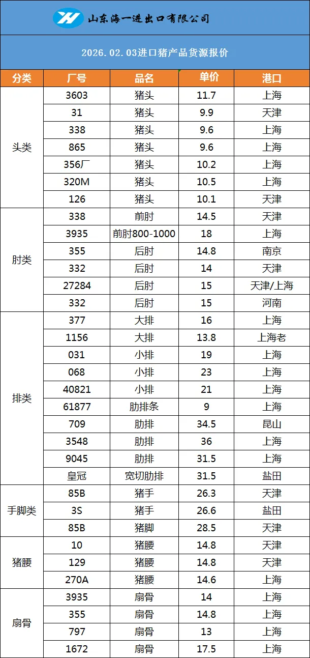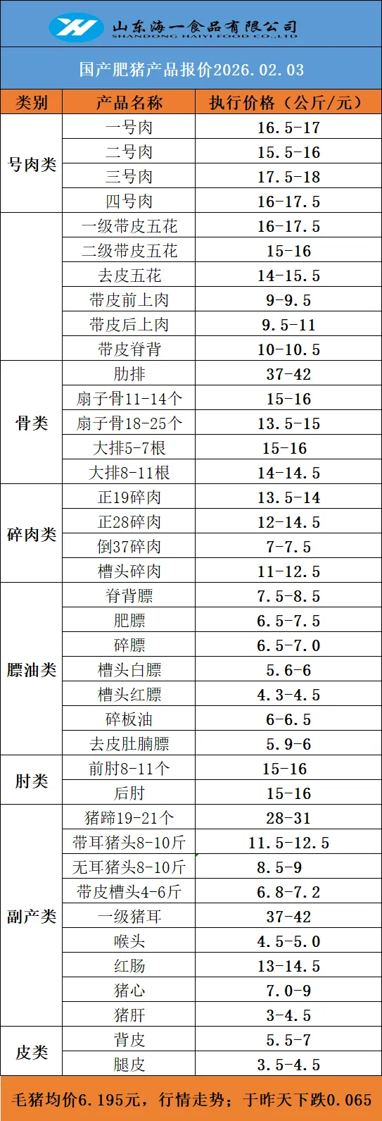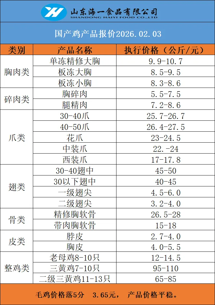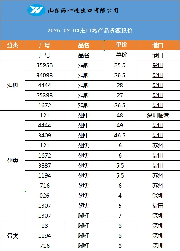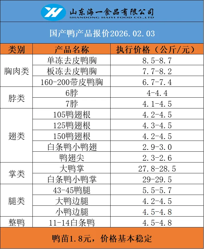 >海一食品02月04日,鸡、鸭、猪冻品价格分享