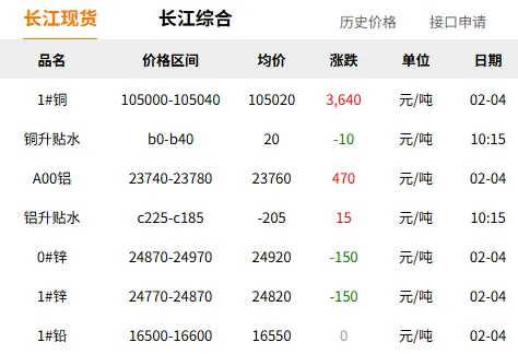 >【今日铜价】02月04日长江有色1#铜行情播报