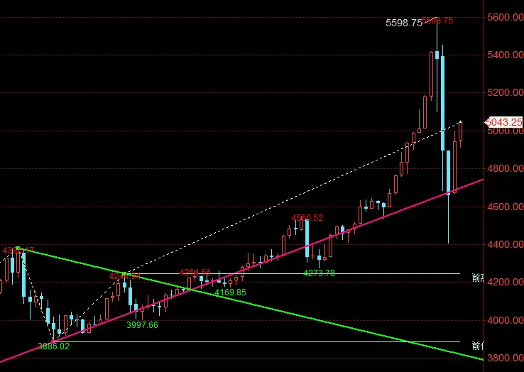 今日黄金开盘于4945附近,开盘后走低至4910点位止跌回升,一度攀升至5050附近后回落。当前来看,黄金多头大概率将突破5100大关后再行回落;从目前蓄势态势判断,5050并非顶部,5100也大概率不是阶段性高点,不排除多头突破5100后进一步诱多,再迎来反转崩盘的可能。