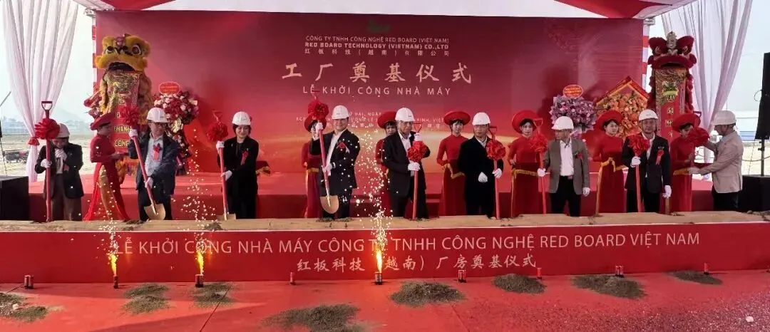 1月10日,广东省中山市2026年第一批重点项目集中动工仪式在火炬高新区民众街道台光电子二期项目现场举行。项目一期为台光电子高性能覆铜板与粘合片项目,已建成投产。项目二期为AI高性能及先进半导体封装电子材料项目,总投资17亿元,项目完工后,形成年产覆铜箔基板720万张、粘合片4200万米的生产能力。(来源:中山火炬发布)红板科技越南工厂奠基