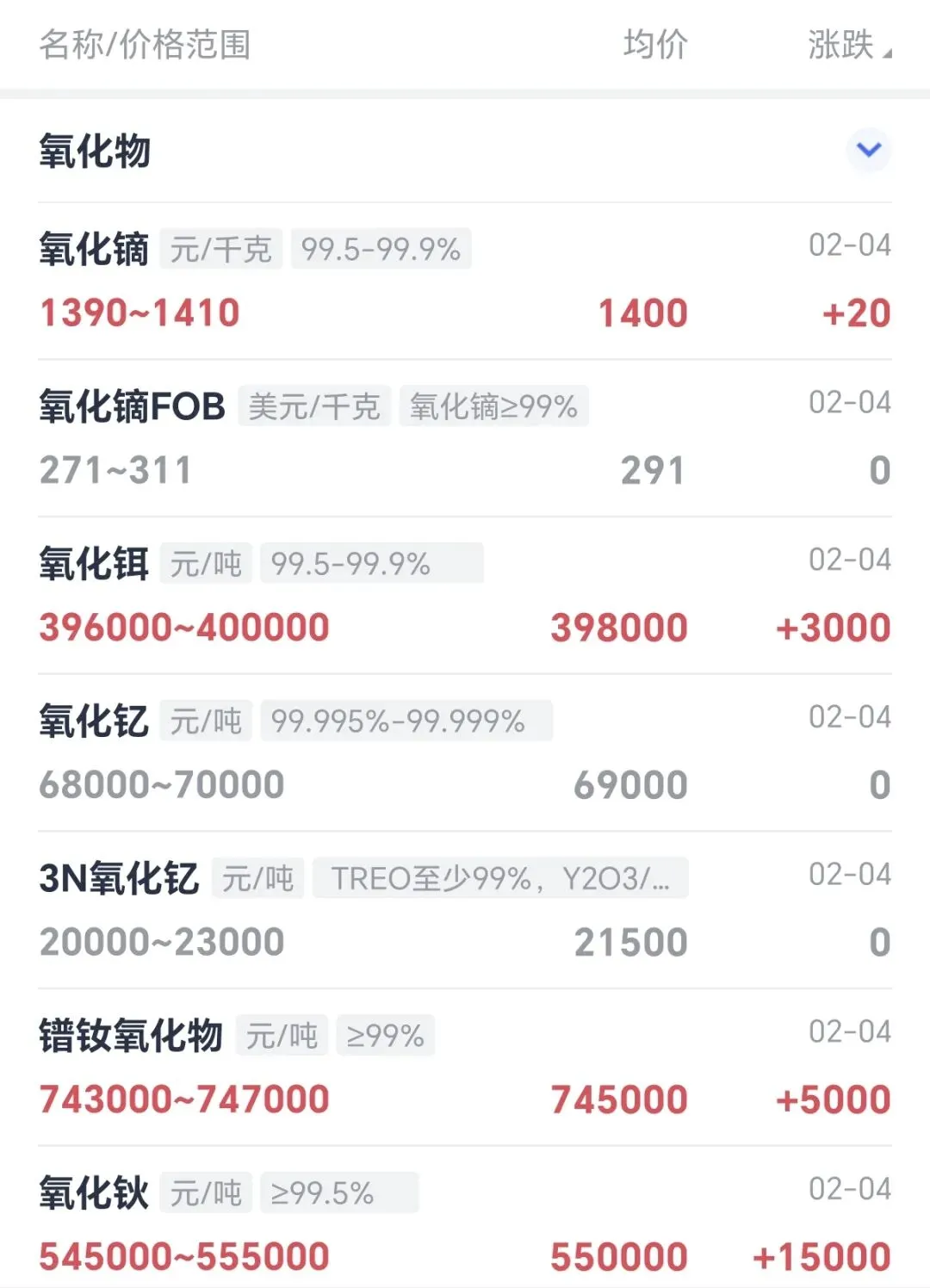 今天是2月4日,我们先来看一组最新的稀土市场价格数据,从中可以清晰感受到市场的暖意正在快速扩散。