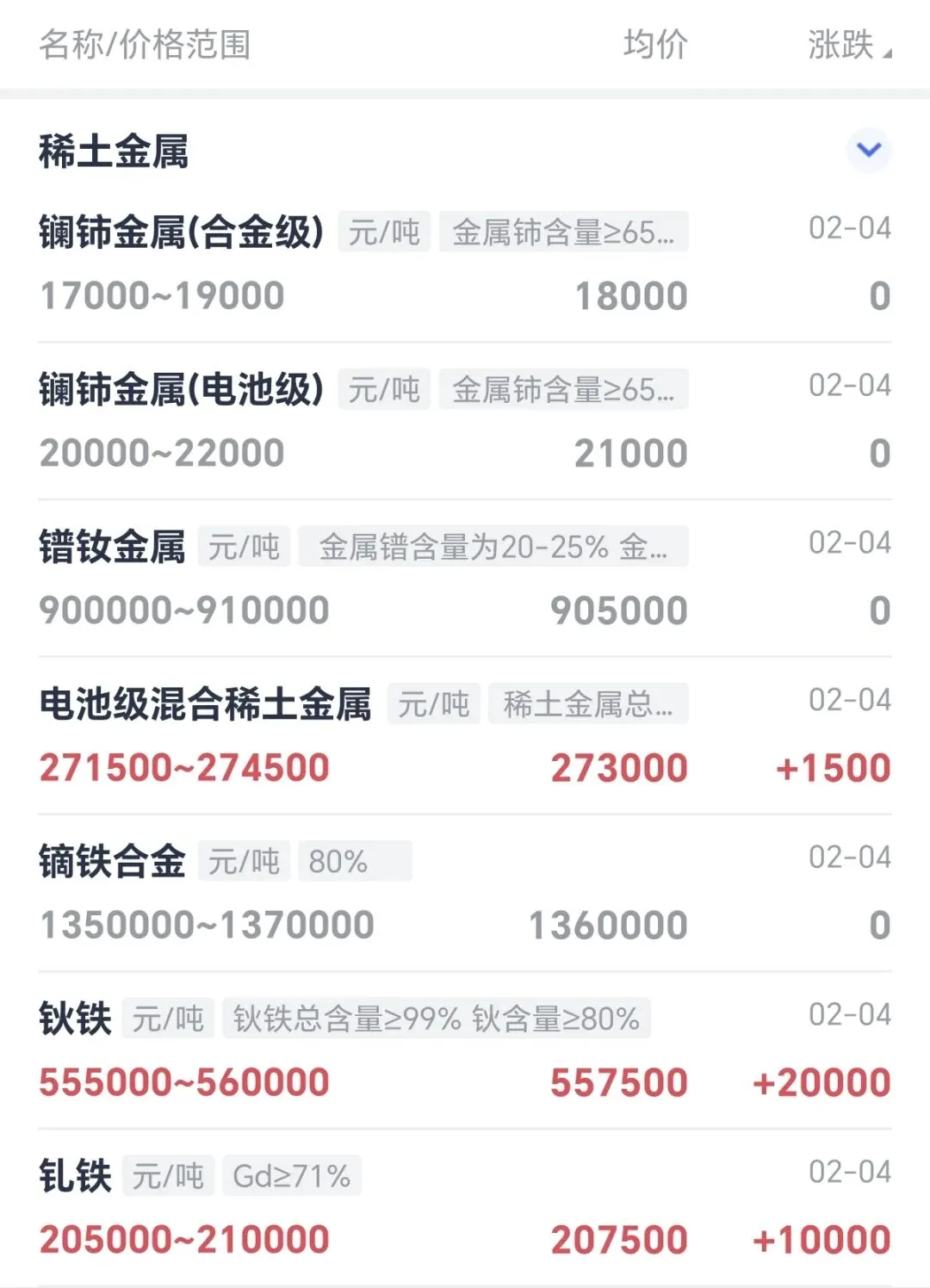 - 钆铁:均价207500元/吨,上涨10000元/吨,与新能源、磁材需求高度相关。