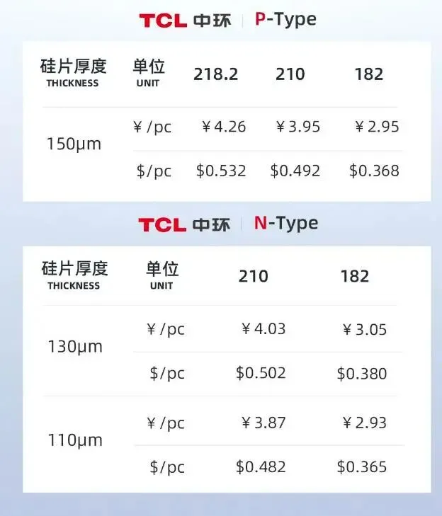 其中,P型硅片,150μm厚度218.2、210、182硅片报价分别为4.26元/片、3.95元/片、2.95元/片,较上次报价分别上涨0.19元/片、0.18元/片、0.1元/片。