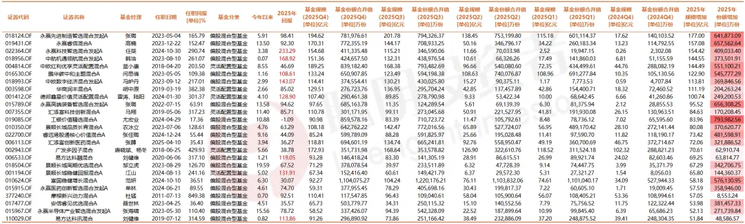 高楠管理的永赢睿信与任桀管理的永赢科技智选,分别增长65.76亿份、40.9亿份,永赢科技智选作为2025年的“冠军基”,全年业绩回报233.29%。