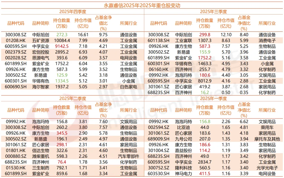 从永赢睿信2025年的重仓股变动来看,年初换仓幅度较大,持仓较为分散,二季度开始布局AI、贵金属与创新药;三季度重点减持创新药。