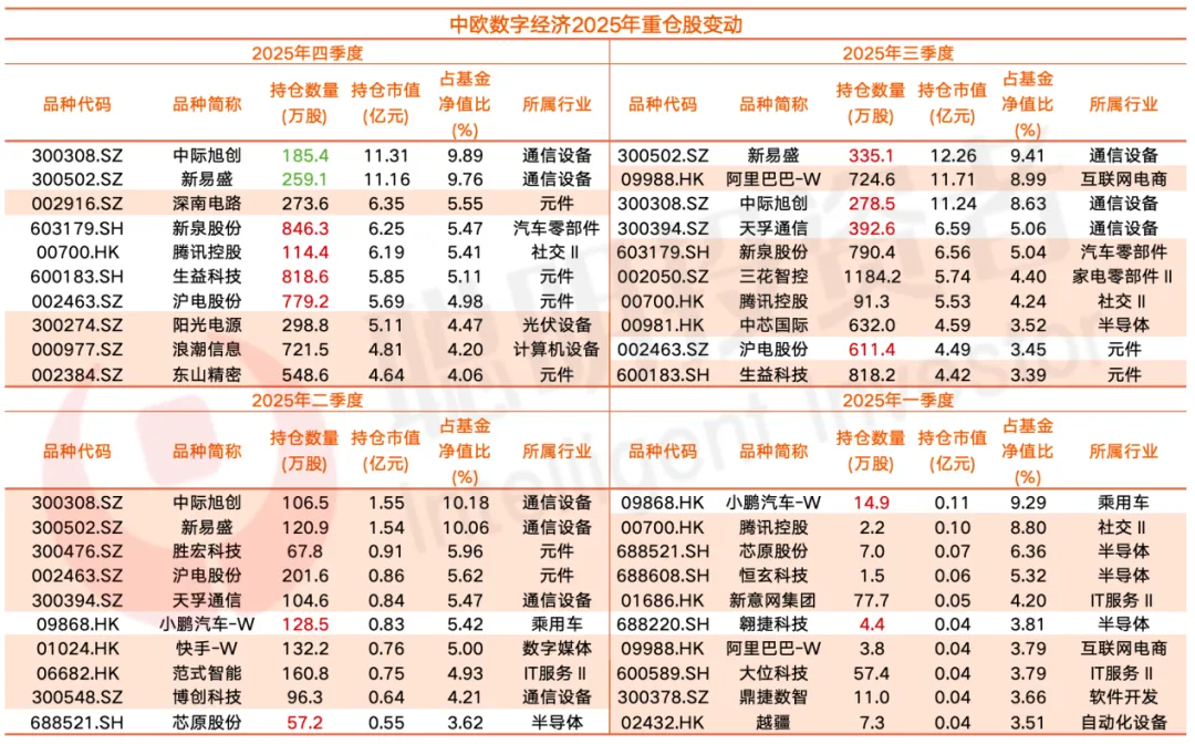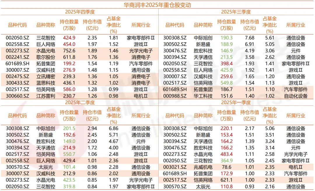 其中包括,2023年二季度买进的中际旭创、天孚通信;2024年四季度换仓的机器人概念的智能制造企业,三花智控、胜宏科技、拓普集团等等。