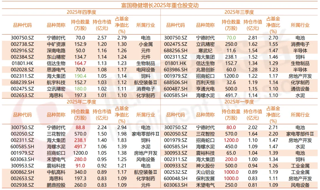 富国稳健增长的行业配置在四季度增加的贵金属、航空装备及AI基础设施,也享受了行业红利,但因为仓位分散,获利不高。