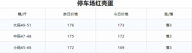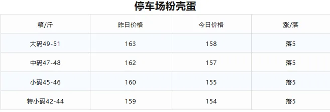 1.停车场粉壳蛋:各规格统一下跌5元/箱