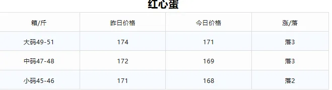 3. 红心蛋:大码、中码下跌3元/箱,小码下跌2元/箱.