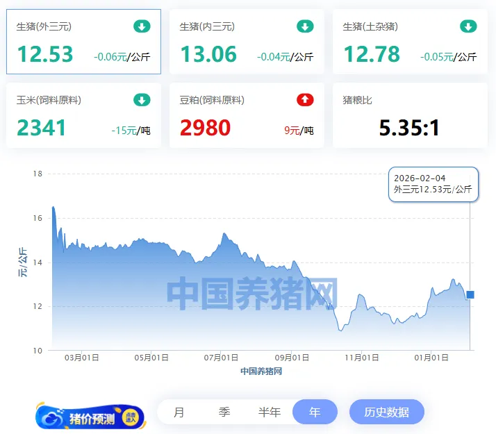 2026年2月4日全国外三元均价12.53元/公斤,今日猪价较昨日报价下跌了0.06元/公斤。
