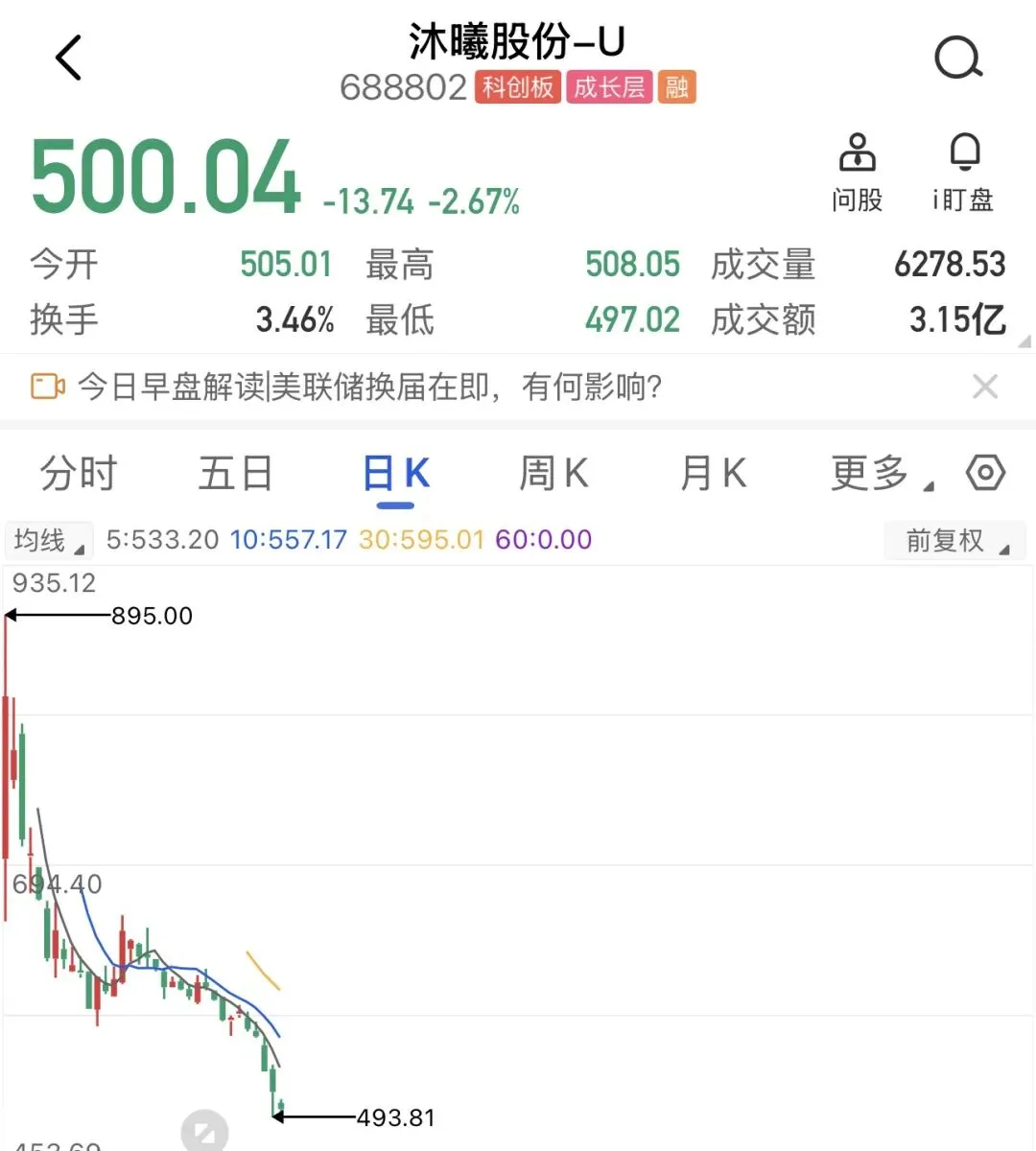 我来看一下去年新上市的科技公司沐㬢股份,发行价104.66元,2025年12月17日上市,第一天股价被爆炒到最高895元,新股上市中签最多可赚近40万元,如今股价也跌到了差不多500元左右了。如果上市当天最高买入的话,短短一个月月时间亏损也将近50%了,所以科技股的投资就是不能追高。