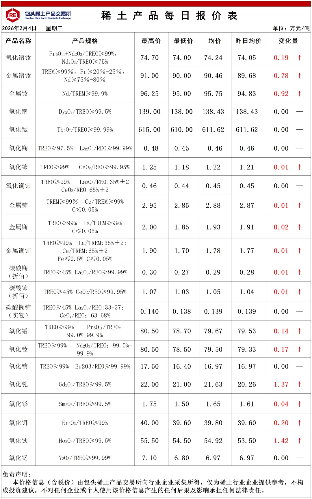 今日稀土主流产品价格小幅上行。氧化镨钕均价74.24万元/吨,上涨0.19万元/吨;金属镨钕均价90.46万元/吨,上涨0.78万元/吨;氧化镝均价138.43万元/吨,与昨日持平;氧化铽均价611.62万元/吨,与昨日持平。今日询价氧化钕、氧化镨、氧化镧铈、氧化铕等产品成交信息较少,请慎重参考。