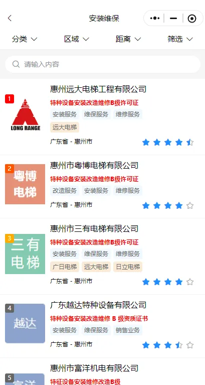 电梯的安全运行离不开定期的维修保养。电梯资讯平台就像一个"维保服务超市",汇聚了全国各地的专业维保团队。你可以根据自己的需求,快速找到附近靠谱的维保人员,查看他们的服务评价和资质,让电梯的日常维护变得轻松又安心。(可以直接定位到附近的公司)
