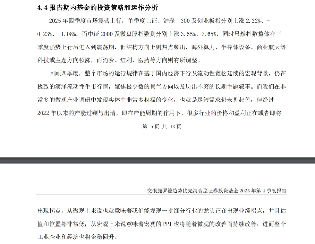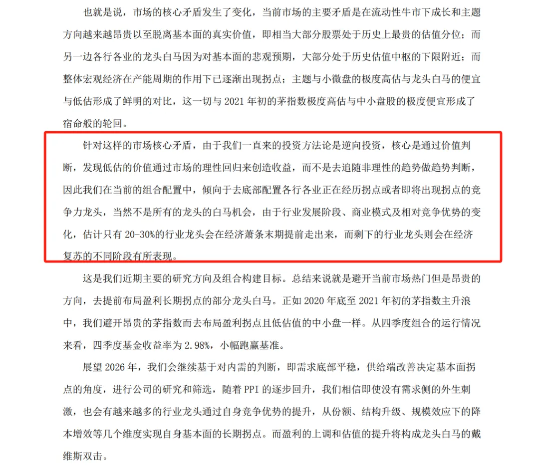 之所以喜欢看优秀基金经理的季报,原因在于季报中有他们的思考,既有对过去的复盘,也有对当下的分析,还有对未来的预判。这个思考过程就像看deepseek的思考过程,逻辑缜密,受益匪浅。交银施罗德基金的杨金金的季报,正是这样一份值得细读的季报。杨金金首先分析了当下经济环境,他认为当下很多行业的价格和盈利正在或者即将出现拐点,从微观上来说也就意味着我们能发现一批细分行业的龙头正在出现业绩拐点,并且估值和位置都非常低;从宏观上来说意味着宏观的PPI也将随着微观的改善而持续改善,进而整个工业企业和经济也将企稳回升。基于经济环境,杨金金认为当下市场的核心矛盾发生了变化,而这段内容也是季报的亮点之一。他表示,当前市场的主要矛盾是在流动性牛市下成长和主题方向越来越昂贵以至脱离基本面的真实价值,即相当大部分股票处于历史上最贵的估值分位;而另一边各行各业的龙头白马因为对基本面的悲观预期,大部分处于历史估值中枢的下限附近;而整体宏观经济在产能周期的作用下已逐渐出现拐点;主题与小微盘的极度高估与龙头白马的便宜与低估形成了鲜明的对比,这一切与2021年初的茅指数极度高估与中小盘股的极度便宜形成了宿命般的轮回。我们之所以认为,当前主动权益基金经理依然存在很大的基金,主要原因之一就是因为A股存在风格的轮动,风格轮动有经济结构的问题,也有投资者情绪的问题,但是这就会导致很多资产会被错误定价。同样质地的资产,被市场认可时估值能达到几十上百倍,而被市场抛弃时又会跌至十几倍,如此大的波动就是基金经理们的利润空间。我们继续看杨金金的季报,对于当下市场的矛盾,杨金金的投资方法论是逆向投资,核心是通过价值判断,发现低估的价值通过市场的理性回归来创造收益。因此在当前的组合配置中,倾向于去底部配置各行各业正在经历拐点或者即将出现拐点的竞争力龙头。不过杨金金也表示,当然不是所有的龙头的白马机会,由于行业发展阶段、商业模式及相对竞争优势的变化,估计只有20-30%的行业龙头会在经济萧条末期提前走出来,而剩下的行业龙头则会在经济复苏的不同阶段有所表现。杨金金管理的交银瑞元三年定期开放混合在4季度布局了3只航空股,其中包括华夏航空、南方航空和中国航空。