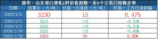 截至2月4日,新华·山东港口热轧C料价格报3230元/吨,较前一交易日上涨15元/吨,涨幅0.47%。