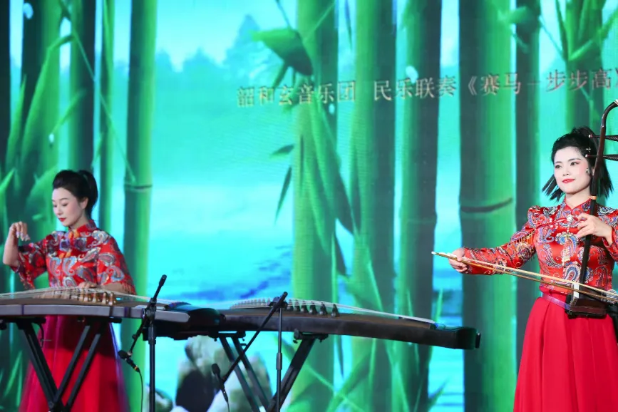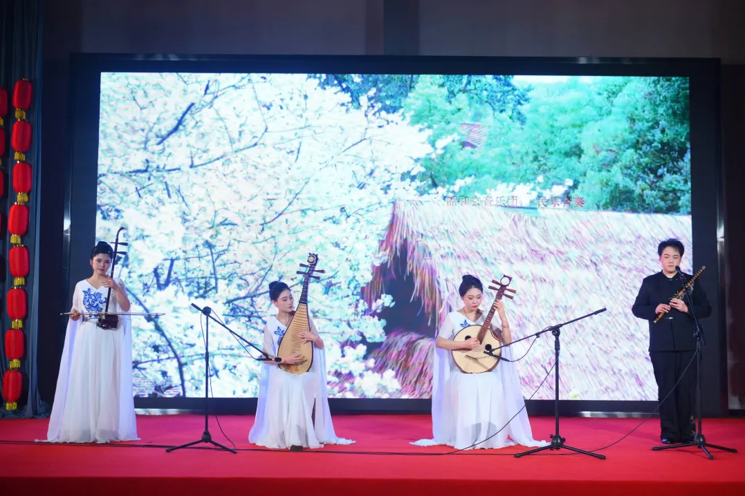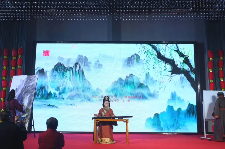 文艺演出环节精彩纷呈。民乐连奏《赛马》《步步高》节奏明快,振奋人心;激光舞《未来战士》融合科技与艺术,炫酷十足;民进会员张弘独唱的《父亲》情真意切,打动全场;绵阳开明画院会员艺术家涂万春、王浈与古琴演奏家李跃带来的现场书画节目《渔樵问答》将古琴演奏、书法创作和国画绘制完美融合,展现了传统文化的独特魅力。此外,歌曲独唱、长笛独奏、传统舞蹈等节目轮番上演,赢得现场观众阵阵掌声。