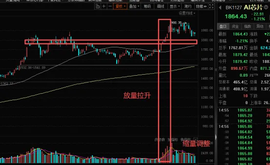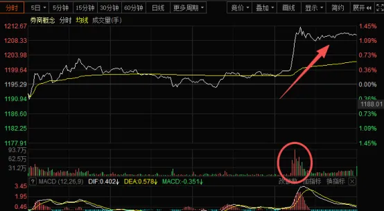 今天上午冲击下颈线附近回落,很多同学担心市场会再度下跌之时,下午谁站了出来?是不是券商,这里也体现了大资金的一个态度,指数难有大的调整空间。