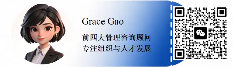 我是 Grace,曾任职于四大会计师事务所的管理咨询部门,如今深耕于组织与人才发展的一线实践。致力于帮助企业突破成长瓶颈、提升管理效能,系统性地吸引、留住并赋能关键人才。