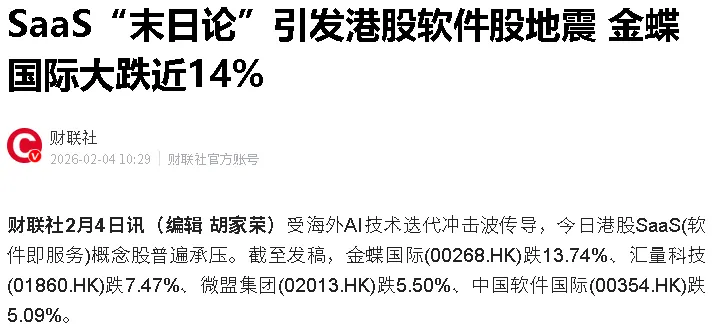 2026年开年,SaaS行业便经历了一场剧烈的“过山车”式震荡。一月份,市场还普遍乐观,将其称为行业发展的“转折点”;而今天,华尔街对SaaS行业的悲观预期近乎“宣判死刑”,直接把港股SaaS板块干成翔:不得不说,这次“西药”下得猛——而这一切的“罪魁祸首”,正是AI。在AI原生工具能以更低成本、更高效率完成同类任务的冲击下,传统SaaS模式正遭遇前所未有的危机,市场恐慌迅速蔓延,引发软件股集体崩盘。。一、为什么说“SaaS已死”?