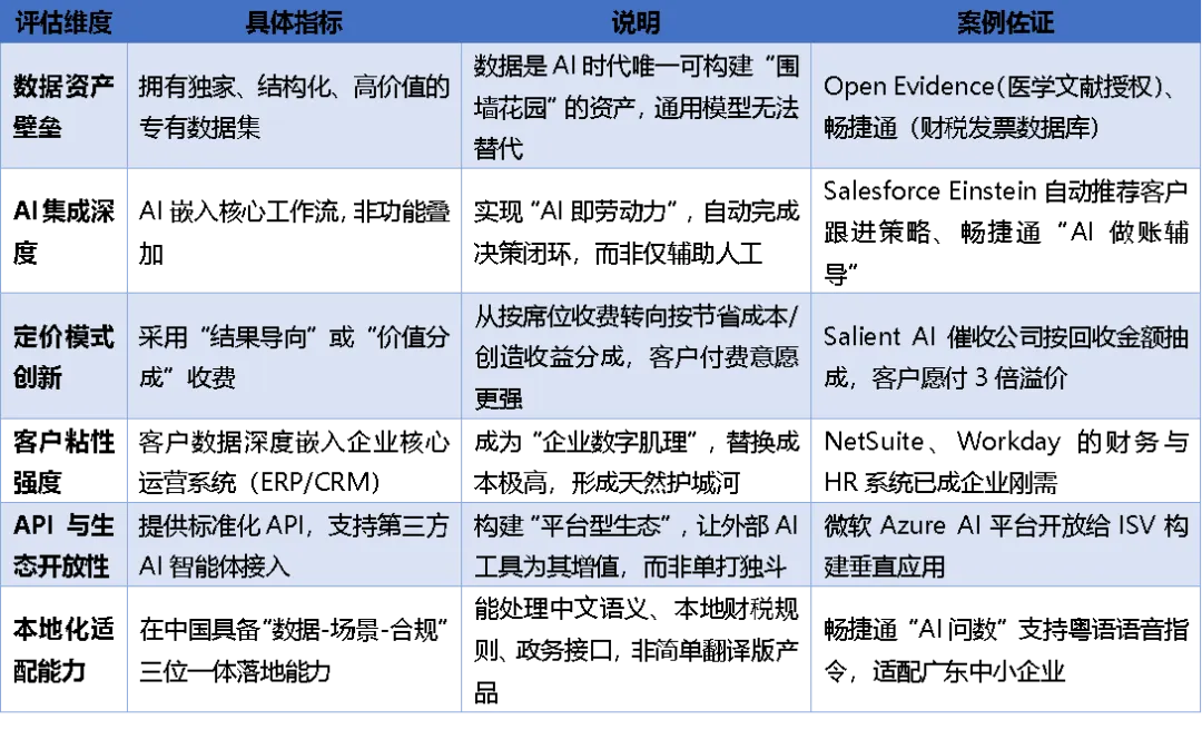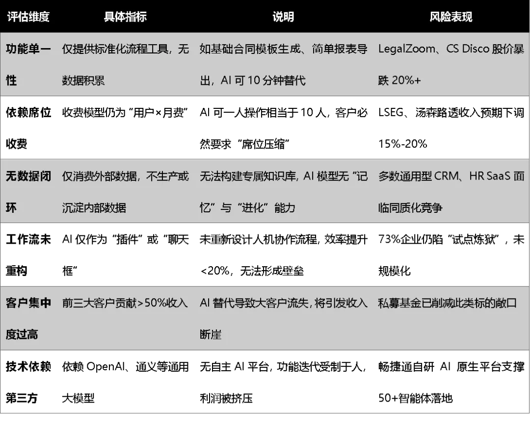 不可否认,AI革命给SaaS行业带来了前所未有的冲击,行业从业者必须主动做出调整,才能适应新的市场环境。但从长期来看,AI并非软件行业的终点,而是推动其向更高效、更智能方向进化的起点。结合顶级投行的分析框加,AI给出了下面的风险清单:✅ 高生存概率企业特征
