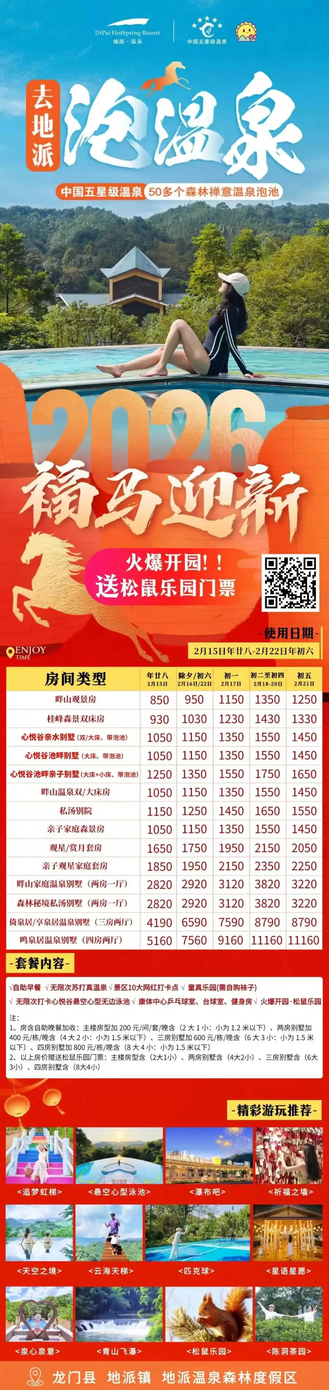 春节价【龙门·地派温泉酒店】¥850起~畔山观景房含早+温泉门票+心悦谷泳池+网红打卡点任游+免费森林步道+200双人自助晚餐