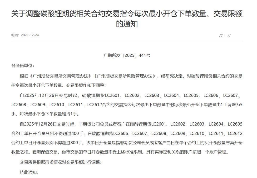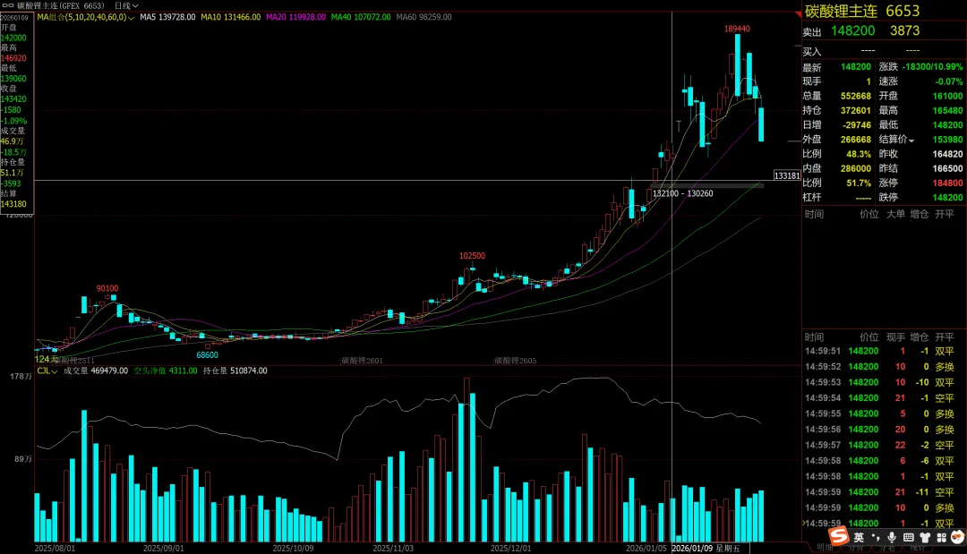 近期的碳酸锂、贵金属以及2016年11月11日的那个夜晚跨多板块的多品种也都经历过一样的事情,正应证了那句老话“太阳底下没有新鲜事!” 情绪一直是投机市场很抽象、难捕捉、难定义的一种东西,高手可以利用对情绪敏锐的把控,利用市场的恐慌低吸,在疯狂快要爆炸、或监管快要干预时离开……但对于散户来说,情绪通常是反作用:韭菜在人声鼎沸时杀入,在扛到万念俱灰离场——而他们交出的带血筹码便会被高手拿去……这是百年投机史不断上演的戏码。 本轮的A型走势里,有个很明显的特征,用股票短线术语来说,贵金属是全球市场的总龙头、是情绪的关键锚点——它是工业紧缺的象征、是美元走弱的象征,是多头逻辑的重要一环…… 但需要注意的是,无论长期逻辑多么牢靠,短期的加速暴涨必然会带来短期高风险偏好的杠杆资金,它们量大到可以左右短期走势:可以爆拉、也可以暴跌。而暴跌对一个品种、板块甚至一个市场都是极其尖锐的挫伤!假设一下,白银的目标价假设是120美元/盎司,花三年的时间慢慢涨到,和一个月的时间暴涨到,这两者积累的风险是完全不可相提并论的,而一旦在暴涨中出现暴力下杀——如这次黄金跌去20%、白银跌去近40%,那对整个贵金属、有色金属、期货甚至股票市场都有很大的影响,覆巢之下,岂有完卵: 1.上证1.29-1.30跌去3.5%,是2025年4月7日特朗普关税战之后的最大黑天鹅;纳斯达克跌去1.5%。 2.贵金属、有色板块集体大跌:铂、钯暴跌;沪铜、沪铝集体大跌10%以上;碳酸锂大跌20%以上。 3.化工板块部分品种也受到较大影响,如橡胶、pta等。 若要说这种情绪激荡、加速拔升的形态对我有什么启示: a.新高加速阶段不建仓、不加仓。在一段趋势中,如果已经屡次创造新高,并且还加速冲刺,说明市场的资金至少短期内趋于一致(做多力量已大多进场、空头力量虎视眈眈),高位对利空消息异常敏感,像本次的特朗普提名沃伦——一个鸽派总统提名“前鹰派”美联储主席候选人就引起了情绪的崩溃。连续加速上扬已经是低盈亏比的买点,不建仓、不加仓。 b.下杀阶段可不必全走、分批止盈,但不急着抄底:因为连续涨停中无法判定何时是尽头。正如6月底的焦煤,接近5天大涨后才迎来大阴线、1月的黄金也加速2日+盘整1日+加速2日。如果叠加交易所、监管机构等的压制系统性风险的限制措施或其他盘面背离迹象,起码可以作为部分止盈的条件。其次,要非常注意上升趋势中加速、波动放大后出现的冲高(涨停)无故回落的情况(如碳酸锂2026.01.13),判断交易所是否可能介入。 c.若基本面仍存,也不接下落的刀子、企稳后再入场。就算遇到了像本次黄金、白银两天跌完一个月跌幅的极端情形,也不可全仓杀入抄底,可以分批入场。若基本面无根本变化仅因为短期杠杆资金。短期的冲高后剧烈回落并非是商品原有趋势终结的充分条件!正如2025年下半年至今的碳酸锂,在6-8月中的反内卷行情中在8w、9w大关经历过两次时间接近的冲高回落!在跌下来盘整后,于10月底又发起冲锋并突破前高,逼近10w关口后又进行短暂休整后一鼓作气直逼19w关口。简而言之,短期情绪巨震不改长期趋势,即使是A杀也并不意味着原趋势的必然终结。 d.反向思考:当空头的情绪笼罩在市场之下时(无论基本面是什么(世界经济通胀通缩、某一产业扩张、萎缩),有时可能只是多头横行霸道的逻辑出现了翻转),一旦这种情绪发酵成整个市场(内外盘、期货、股票)的下杀,一定要果断抽身——覆巢之下、岂有完卵,君子不立危墙之下。但同时不能完全一棍子打死,危中藏机,需努力观察有什么标的最抗跌,一旦情绪企稳,那么这些品种就会有机会,如焦煤、PVC等。①价格与持仓量背离,成交量与持仓量背离(如图)。1月29日大涨,但成交量减少近33万,且在大涨日主力合约出现空头净值为正!②1.23-1.26的关键平台点位突破时, 散户和主要机构席位竟出现共振,共同做多白银,但部分机构席位净持仓却出现背离! 供给侧:2025年8月起,国家通过新版《矿产资源法》强化战略性矿产资源保护性开采,江西宜春“亚洲锂都”成为整顿重点。宁德时代旗下枧下窝锂矿(设计年产能约11万吨碳酸锂当量,占全国8.5%)因采矿权到期未续签而停产,叠加8家涉锂矿山企业被要求重新提交储量与合规报告,导致锂云母提锂产能短期大幅收缩。同期,青海盐湖部分产能亦因环保审查暂停,国内锂盐供应增速明显放缓。2025年12月,国家发改委明确将“反内卷”作为“新三样”产业高质量发展的核心方向,严控低效产能扩张与无序竞争,新增锂盐项目审批趋严,市场对供给端持续收紧形成一致预期。 需求侧:新能源汽车销量持续高增+储能电池爆发式增长(全年储能新增需求首次超过动力电池新增需求) 而最近一次的冲锋回落是源于2026年1月9日,财政部、税务总局公告明确自2026年4月1日起电池出口退税率由9%下调至6%,2027年1月1日起完全取消。市场预期海外客户将集中抢在政策生效前下单,带动一季度动力电池及正极材料排产前置,形成“抢出口”逻辑,直接推升碳酸锂短期需求预期。 这是一个明显的利好消息,在这则利好出台前的1月5日-1月9日,碳酸锂价格已从12万突破到14万,成交量萎缩,但持仓量小幅上行,且现货价格同步上行,倾向于解读为惜售情绪。主力合约基差在缩小,而1月9日消息公布之后,期现基差出现明显的扩大。且在消息发