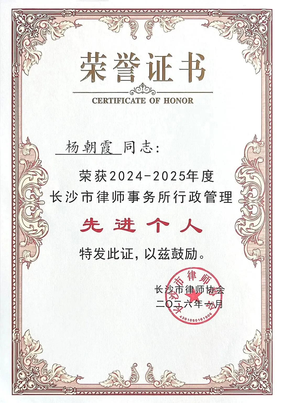 2024-2025年度长沙市律师事务所行政管理先进个人荣誉证书