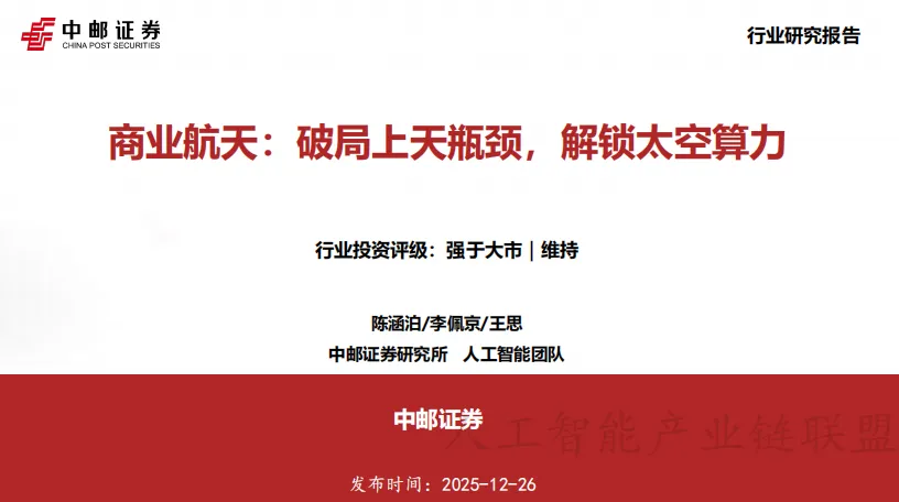 中邮证券研究所人工智能团队在2025年末发布的这份重磅研报,给出了"强于大市"的行业评级,揭示了商业航天正在经历的深刻变革——从"一次性"时代迈向可回收火箭主导的"低成本、高频次"新纪元,而太空算力正成为商业航天最具想象力的下一站。