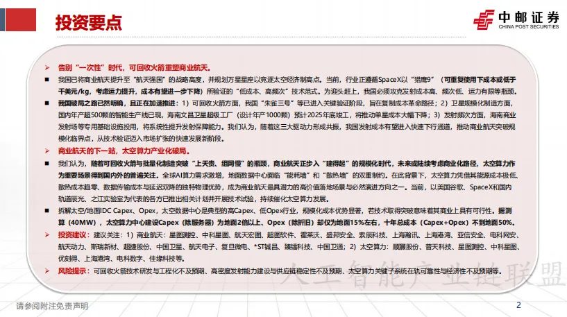 商业航天正站在从"技术验证"迈向"市场扩张"的历史转折点。可回收火箭突破"上天贵"的瓶颈,卫星批量化制造突破"组网慢"的瓶颈,商业航天发射场建设提供系统性保障,三大驱动力形成共振,推动我国发射成本进入快速下行通道。而太空算力作为"建得起"之后的"用得好、算得快、赚得稳"的终极命题,凭借能源无限、散热天然、低延迟传输的物理优势,正在成为商业航天最具潜力的高价值落地场景。这一从"航天强国"到"太空算力强国"的跃迁,或将开启万亿级的新赛道。