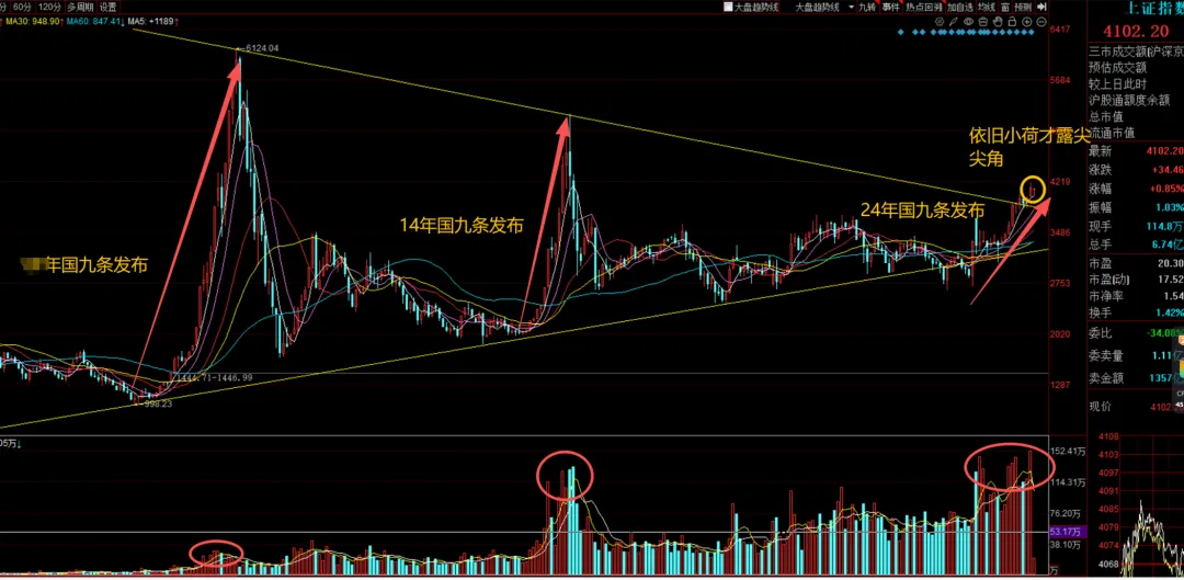 每一次 “国九条” 发布后,A 股都会迎来一波波澜壮阔的牛市。去年 “国九条” 落地后,大资金已经在悄悄入场布局,初期成交量就直接超过了 07 年、14 年牛市的顶峰水平,这就是最实打实的信号加上当下全球降息周期,银行 340多 万亿存款,M1 资金持续流入,现阶段指数依旧小荷才露尖尖角。