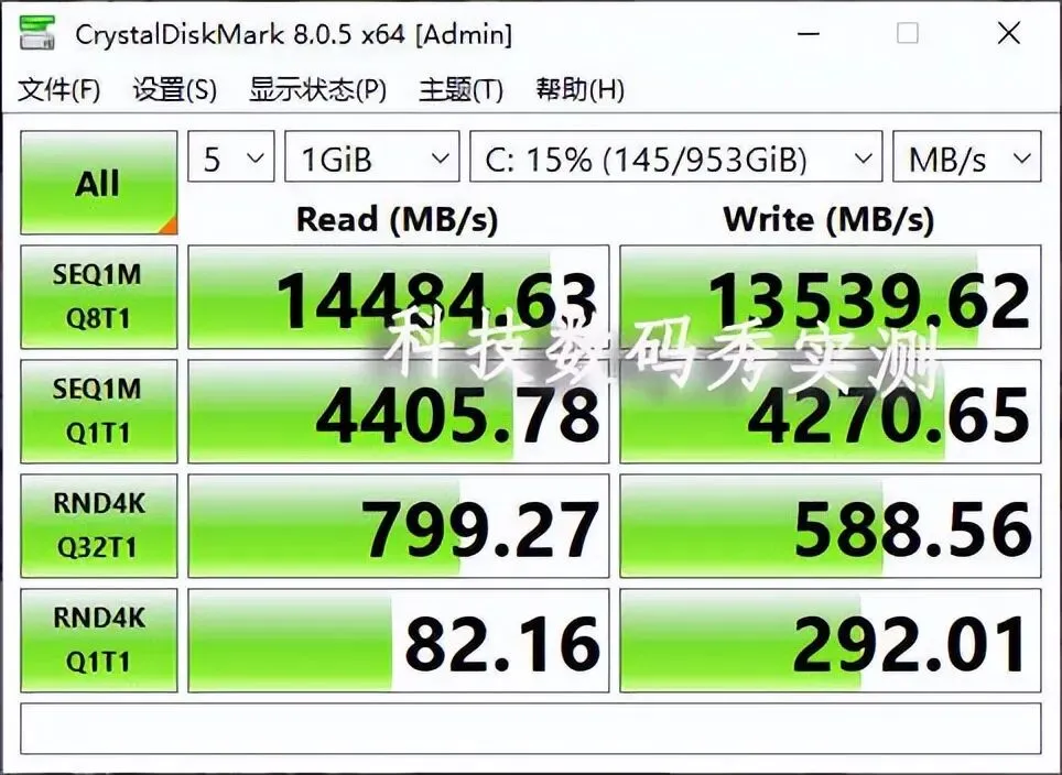 通过业内常用测速工具CrystalDiskMark测试,铠侠VE10的读取速度高达14484MB/s,写入速度高达13539MB/s,几乎和官方标称值没有太大的差距,属实相当强悍,相比PCIe4.0时代的7000MB/s读写,速度简直又翻了一倍!