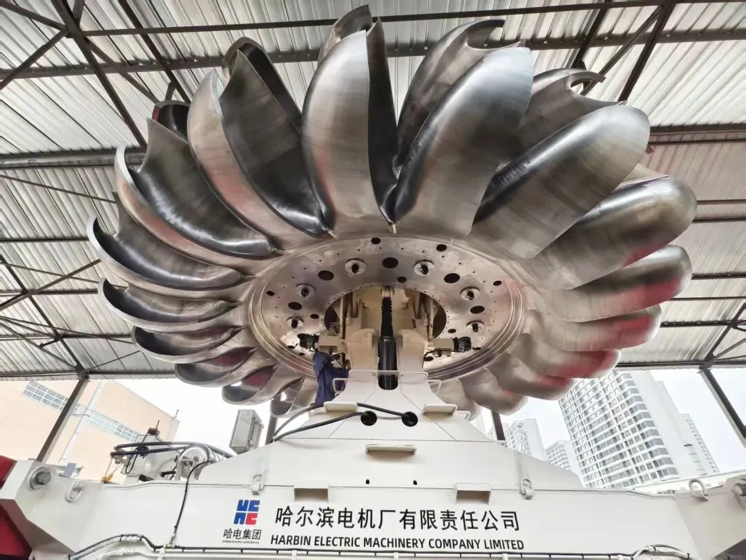哈电集团电机公司依托能源领域首套重大技术装备——大唐扎拉水电站500兆瓦冲击式水轮发电机组,攻克了复杂环境、超高参数等极限条件下大型冲击式水轮发电机组转轮复杂曲面超厚水斗焊接、水斗大深腔曲面的高效高精加工的技术和装备难题,创新构建极限制造条件下综合水力、结构、材料、工艺等多因素的超大型冲击式转轮智能优化设计方法,成功研制全球首台500兆瓦级大型冲击式水轮发电机组成套装置。该装置核心部件——冲击式转轮外径达6.23米,打破马氏体不锈钢最大锻件纪录,标志着我国在高水头、大容量冲击式水轮发电机组核心装备领域实现历史性突破。