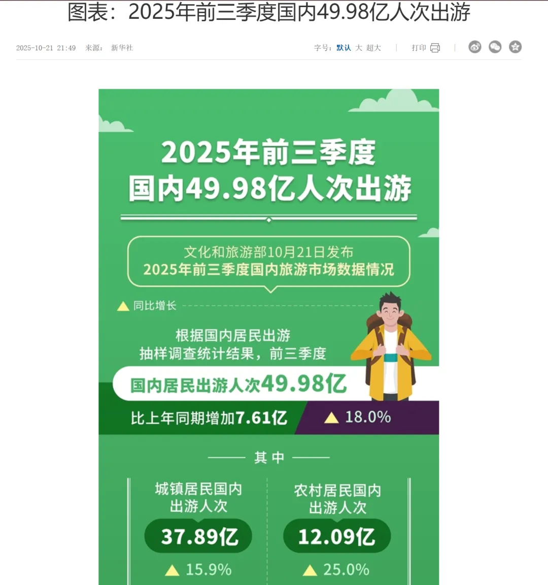 25年10月份,新华社报道一组数据,国内居民出游人次近50亿,比上年同期增加7.61亿,增长18%。尽管人均消费金额下降,但旅游经济从数据来看显得十分好。