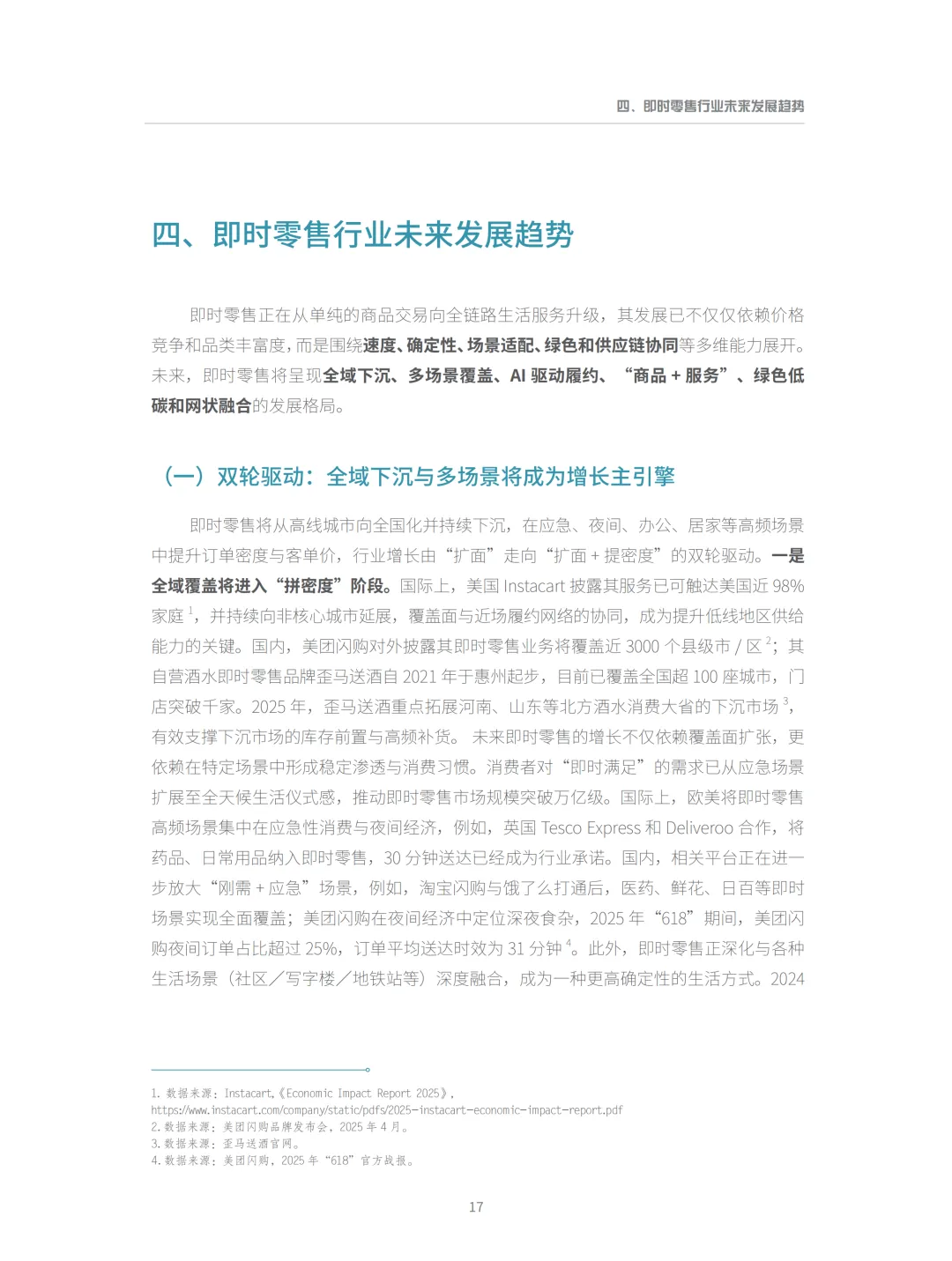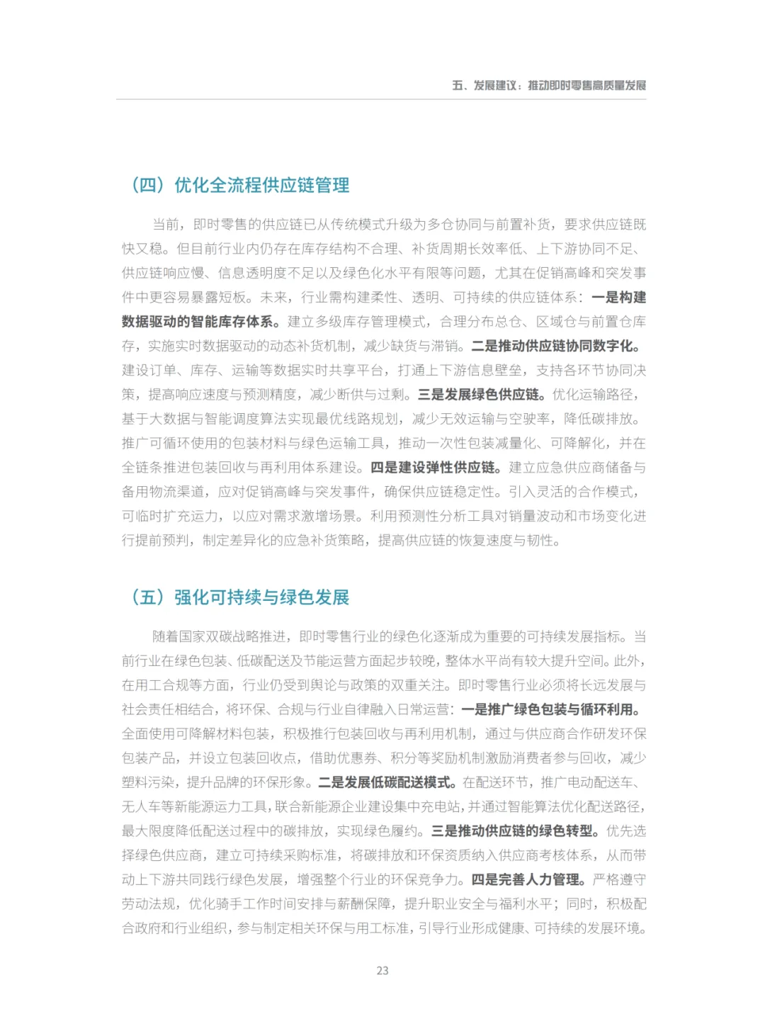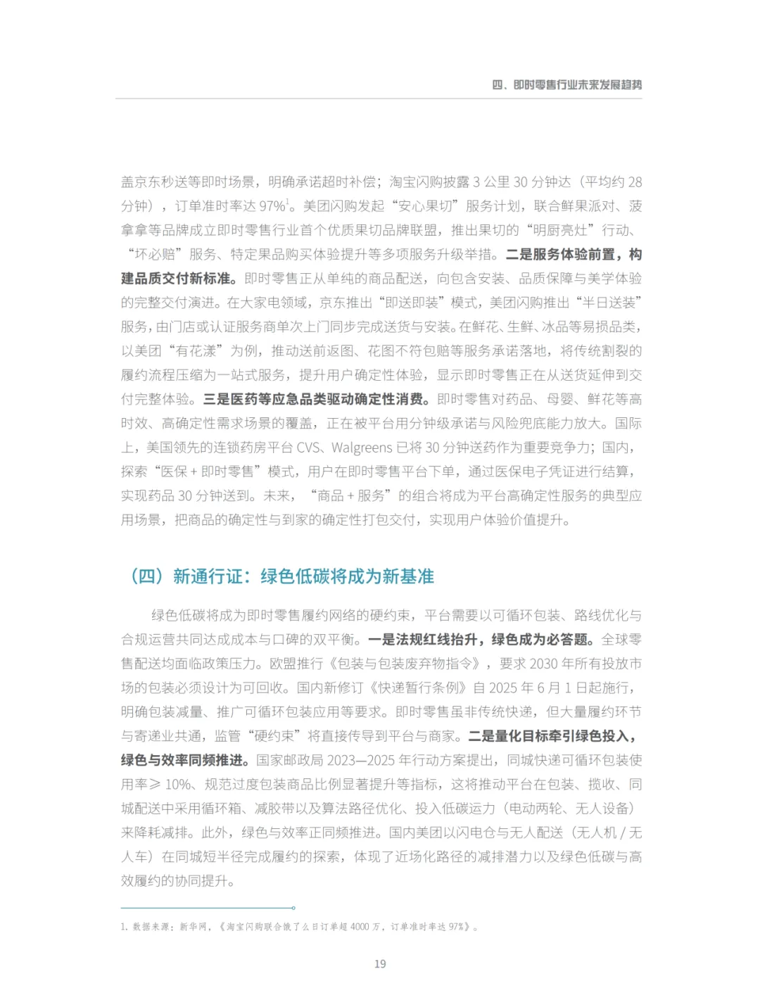 展望即时零售行业未来发展趋势,《报告》指出,即时零售正在从单纯的商品交易向全链路生活服务升级,其发展已不仅仅依赖价格竞争和品类丰富度,而是围绕速度、确定性、场景适配、绿色和供应链协同等多维能力展开。未来,即时零售将呈现全域下沉、多场景覆盖、AI驱动履约、“商品+服务”、绿色低碳和网状融合的发展格局。