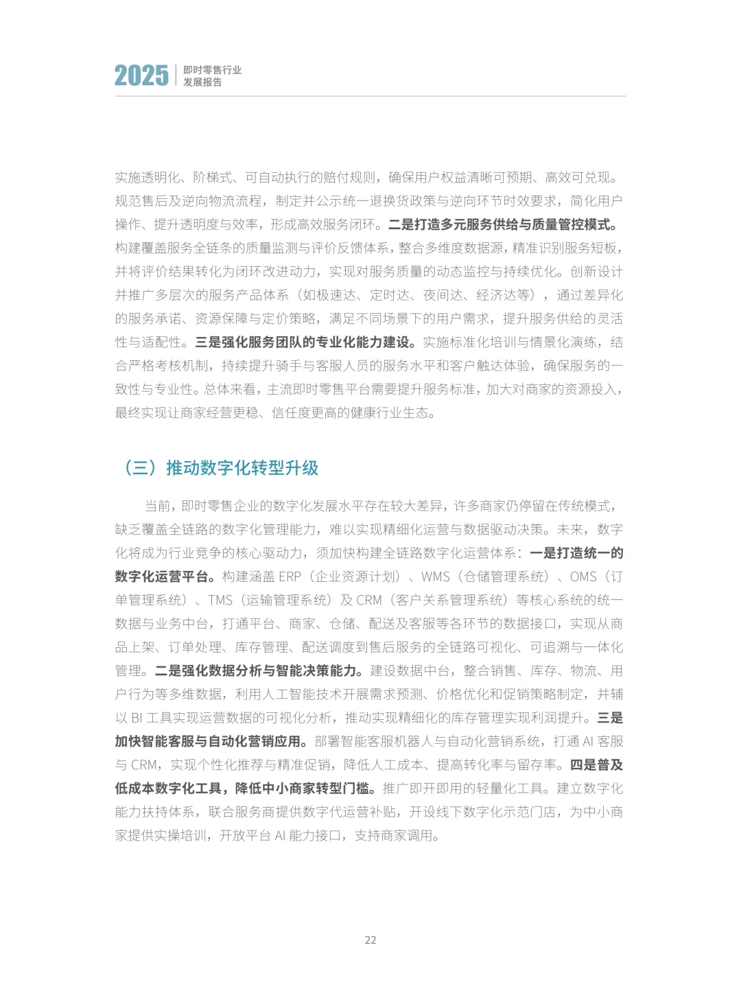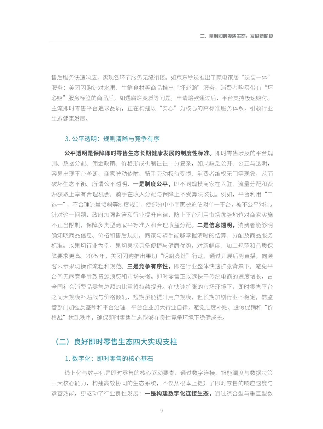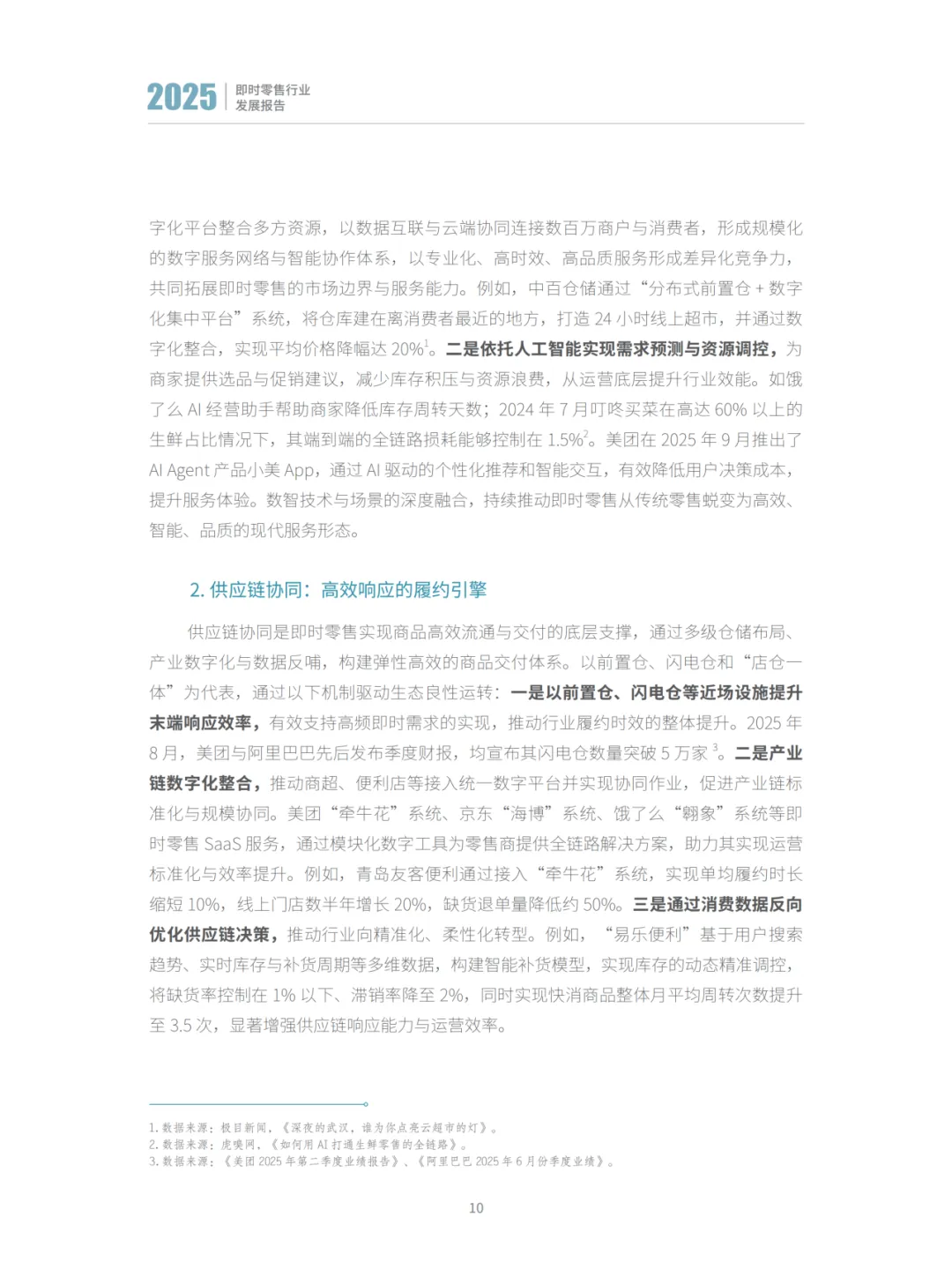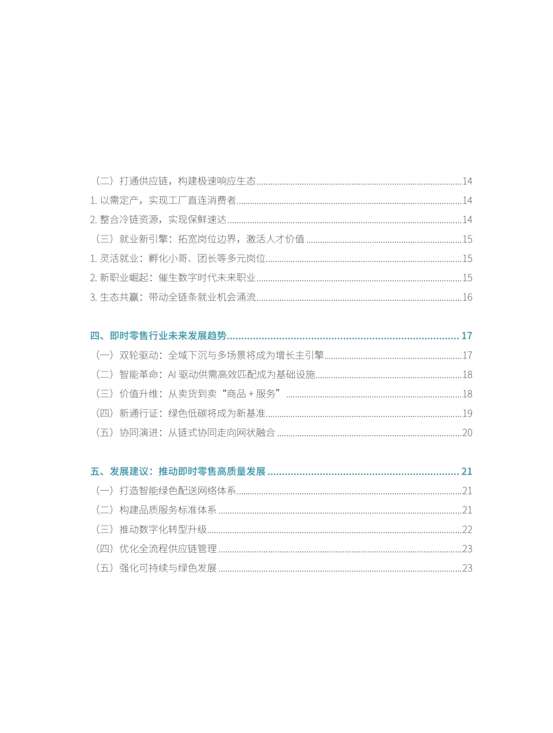 展望即时零售行业未来发展趋势,《报告》指出,即时零售正在从单纯的商品交易向全链路生活服务升级,其发展已不仅仅依赖价格竞争和品类丰富度,而是围绕速度、确定性、场景适配、绿色和供应链协同等多维能力展开。未来,即时零售将呈现全域下沉、多场景覆盖、AI驱动履约、“商品+服务”、绿色低碳和网状融合的发展格局。