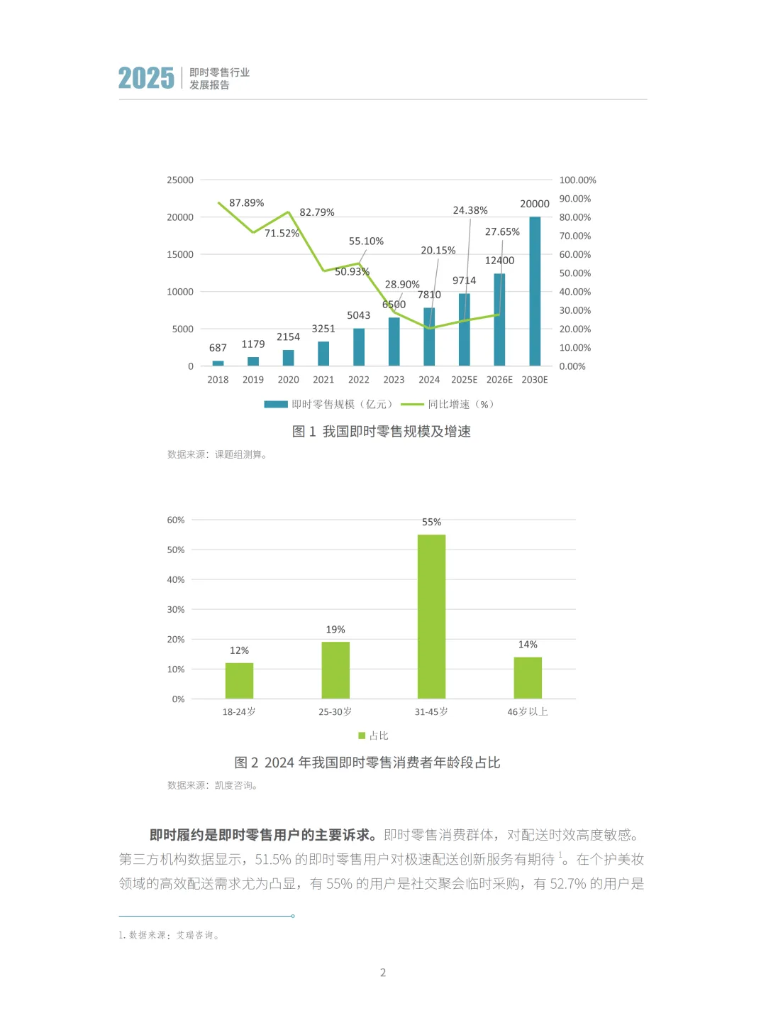 从客户群体来看,《报告》分析认为,年轻群体是即时零售的主要客群。据第三方机构调研,2024年,我国即时零售31岁至45岁消费群体占比达55%,比2023年增加5个百分点。从平台数据来看,青年消费者占主导,美团闪购数据显示,截至2025年3月,平台上90后占比超过三分之二。