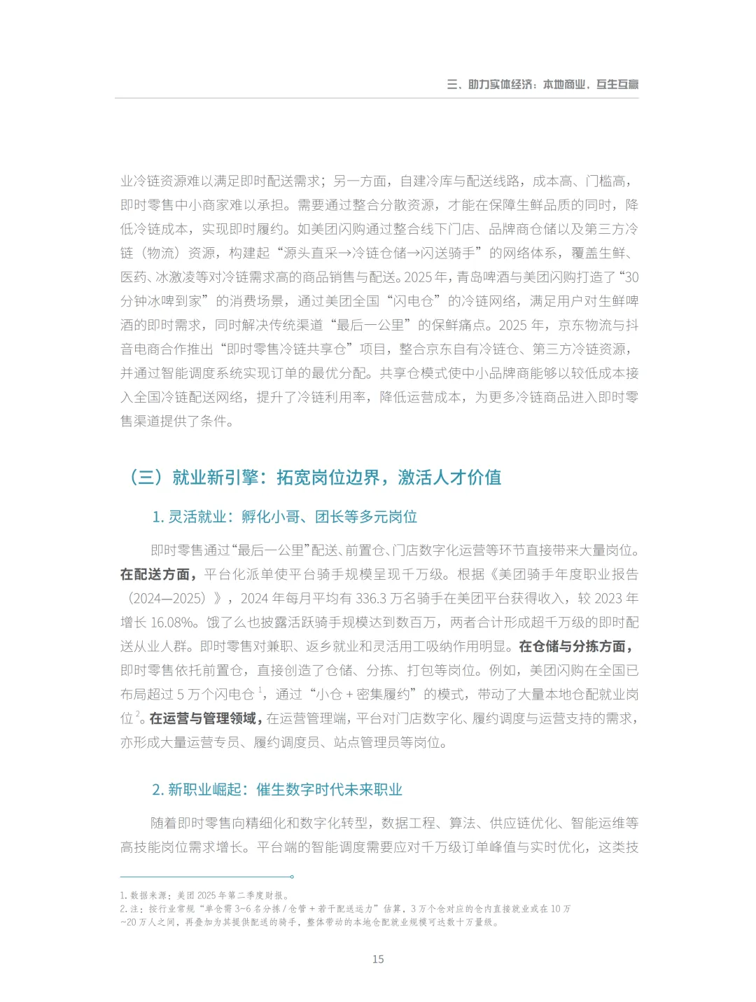 从市场来看,《报告》显示,即时零售平台加快拓展县域市场,成为即时零售增长的重点领域。如美团闪购已覆盖了全国2800个县市,截至2025年9月在下沉市场闪电仓布局超过一万家,下沉市场用户数、订单量及交易额增长率均超过高线城市。未来县域市场仍有较大潜力,一方面,农村网民用户体量大为即时零售在县域快速渗透创造了有利条件;另一方面,农村消费支出提速将扩大即时零售县域市场规模。