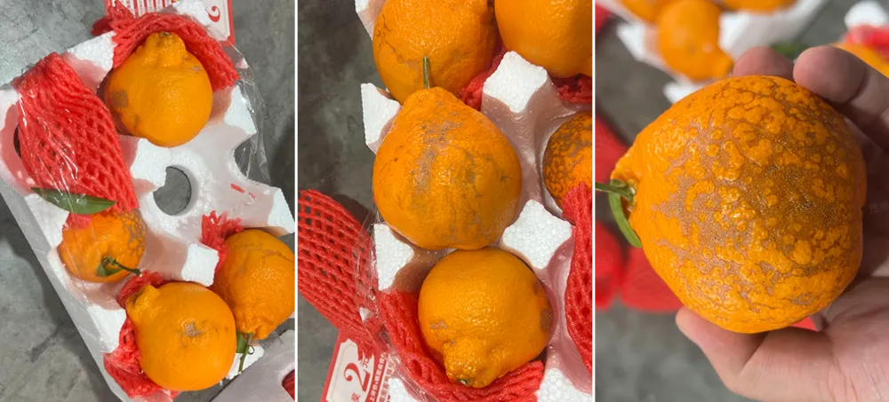 一个小内幕:会有商家以低价收这些“次果”再次售卖,这是我们同事在某电商平台买回来的果子,一箱都是次果。