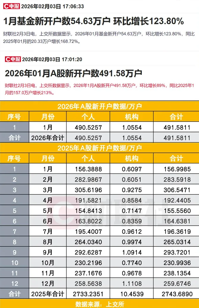 上交所数据显示,2026年1月A股新开户491.58万户,环比增长89%,同比2025年1月的157.0万户增长213%,且高于2025年所有月份。