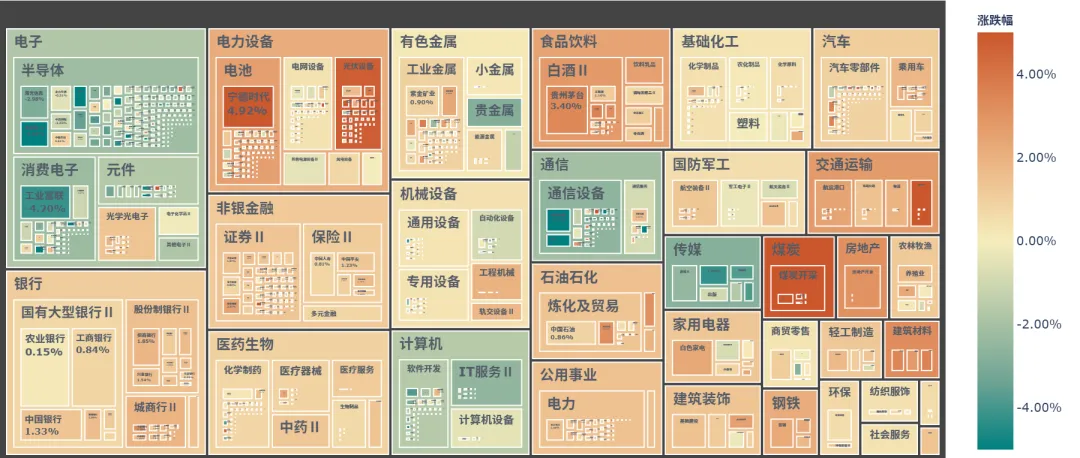 申万一二级行业热力图,体现行业每日涨跌情况。