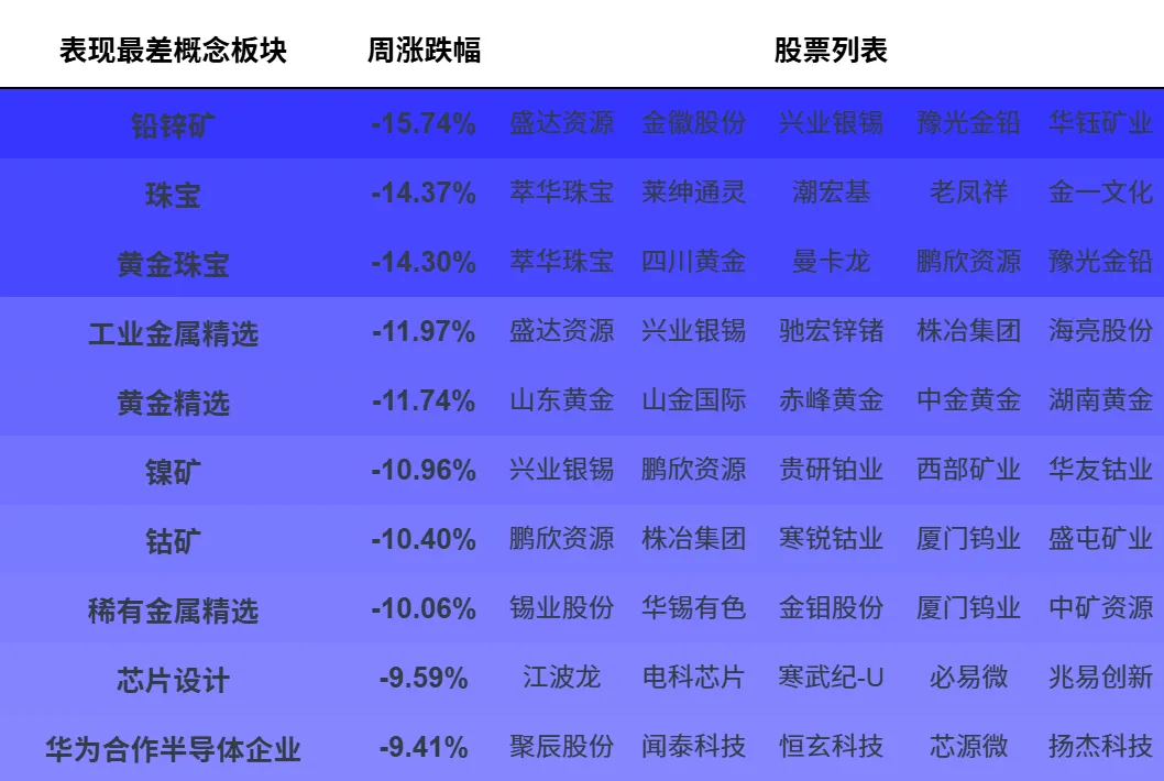 本文选取Wind热门概念板块进行日度和周度(滚动7个自然日)进行跟踪,分别展示表现前10和后10板块的表现情况并展示5个以内的代表标的。