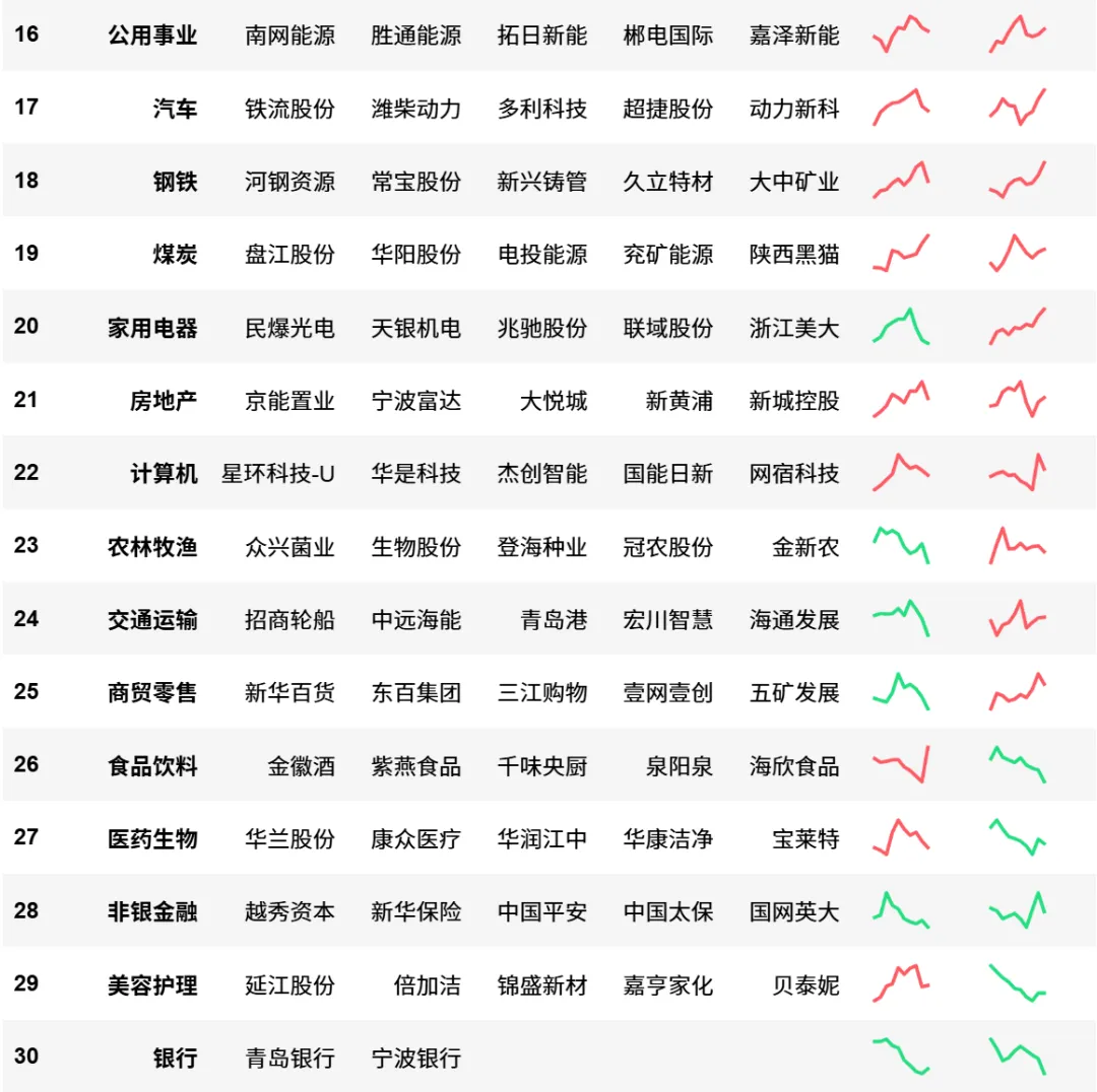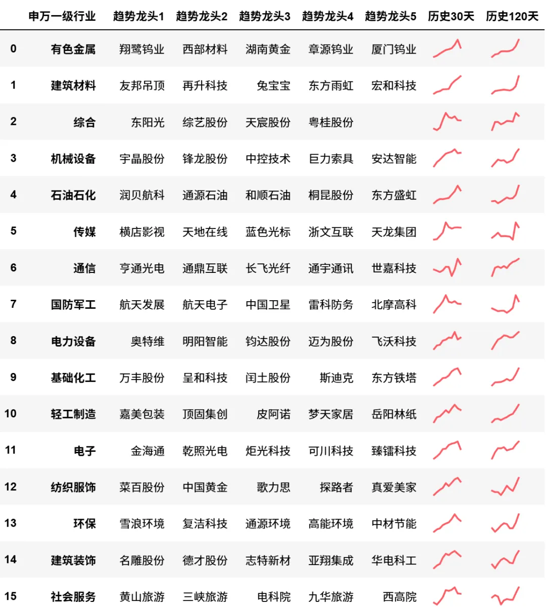 个股由左到右是对每个申万一级行业内部个股动量的排名,并计算趋势龙头前5名,个别行业若前5名动量低于全市场前30%不予显示。