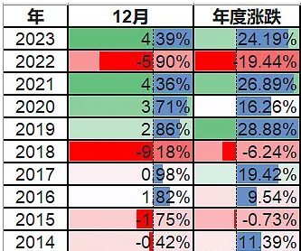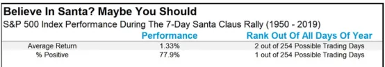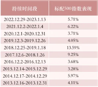 美股市场中存在一种被称为“圣诞行情”的现象,即每年12月的最后五个交易日和次年1月的头两个交易日美股往往表现强势(共7个交易日)。