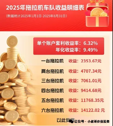 欢迎一起来拖拉机套利。搞得好的话,截止8月底,今年已经通过套利赚了1.5W左右了。欢迎感兴趣的朋友找我开户(市面上支持“一拖六”的拖拉机套利的券商极少,而且需要费率很低才划算)学习拖拉机套利。