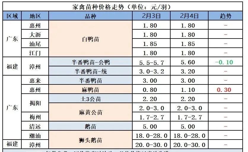 2026年2月5日鸭苗价格行情:(单位:元/羽)