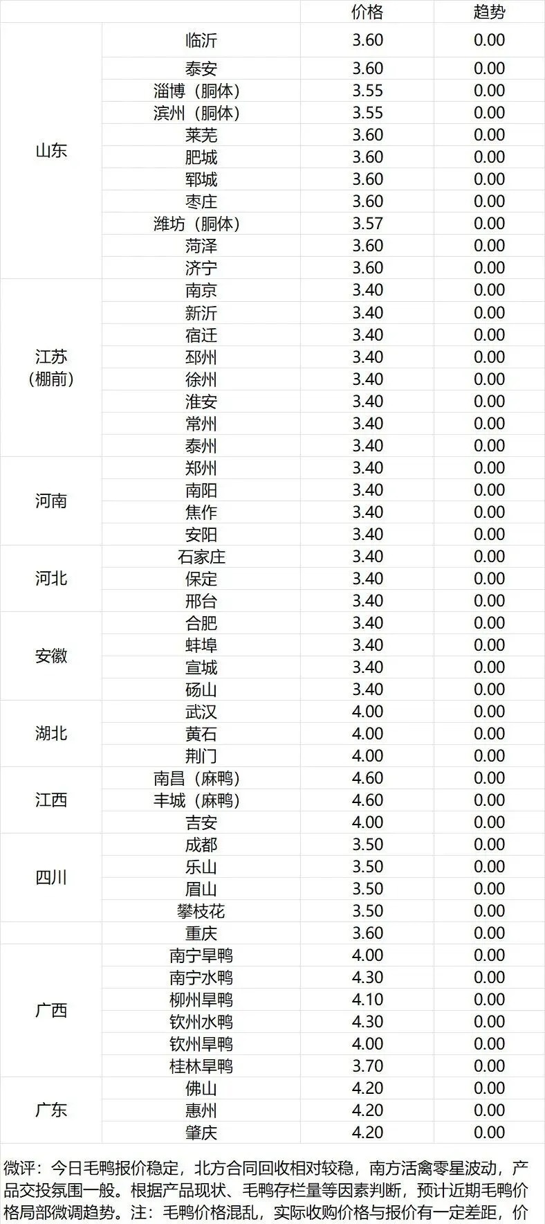 | 微评:鸭苗报价稳定。(注:南方只报当天价格)计划平稳,供需平衡。根据产品、养殖成本及鸭苗现状分析,预计近期鸭苗价格呈稳中微调趋势。种蛋报价稳定。温馨提示:该价格为主流厂家报价,实际销售价格以成交价格为准,价格仅供参考。 |