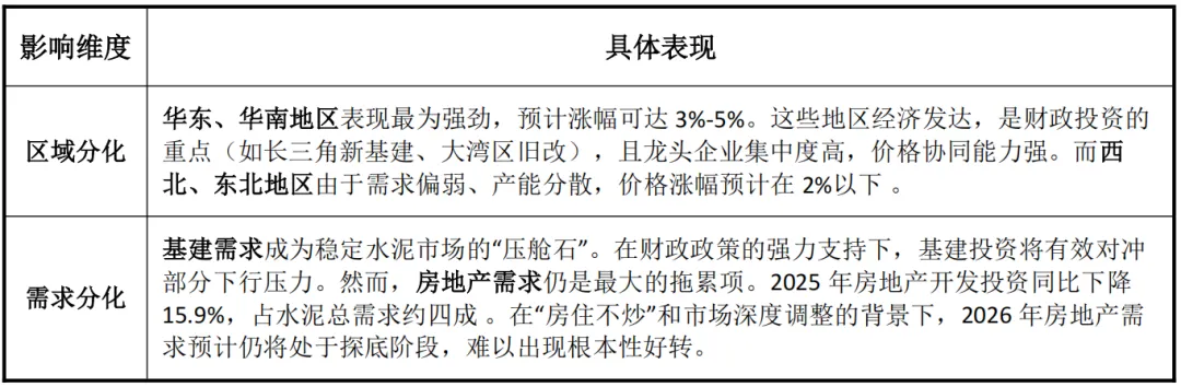 综合供需、成本和竞争格局,我们预计2026年水泥价格将呈现温和上涨,但存在显著的结构性分化。