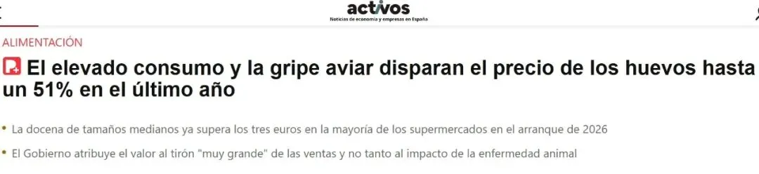 鸡蛋价格大幅上涨的主要原因是西班牙乃至欧洲的鸡蛋产量下滑,而产量减少则由多重因素共同导致:禽流感疫情在欧美多地暴发,数百万只蛋鸡因此被扑杀;2023年3月28日颁布的《动物权利与福利保护法》推动养殖场进行模式转型,大幅推高了养殖成本;与此同时,饲料与电力价格的上涨也进一步加剧了养殖端的成本压力。