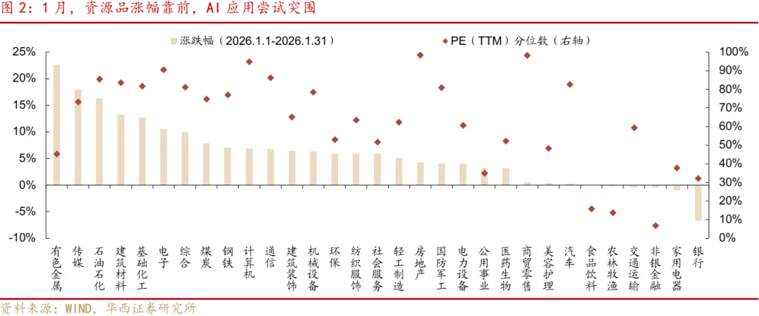 结构上,资源品涨幅靠前,AI应用尝试突围。有色金属在1月涨幅领先,既有商品市场上涨的推动,也有趋势加速的资金介入。一方面,贵金属、工业金属和小金属价格持续走高,有色金属股票成为资金关注的方向;另一方面,在商业航天行情趋弱后,偏好趋势加速的资金需要寻找落脚之处,推动有色金属行情加速上涨。同时,石油石化、建材和化工也均受益于涨价逻辑。此外,传媒涨幅靠前,主要与AI应用热度升温相关,GEO、Agent等概念受到关注。而银行跌幅相对较大,在题材热度较高的情况下,红利逻辑暂不受市场青睐。