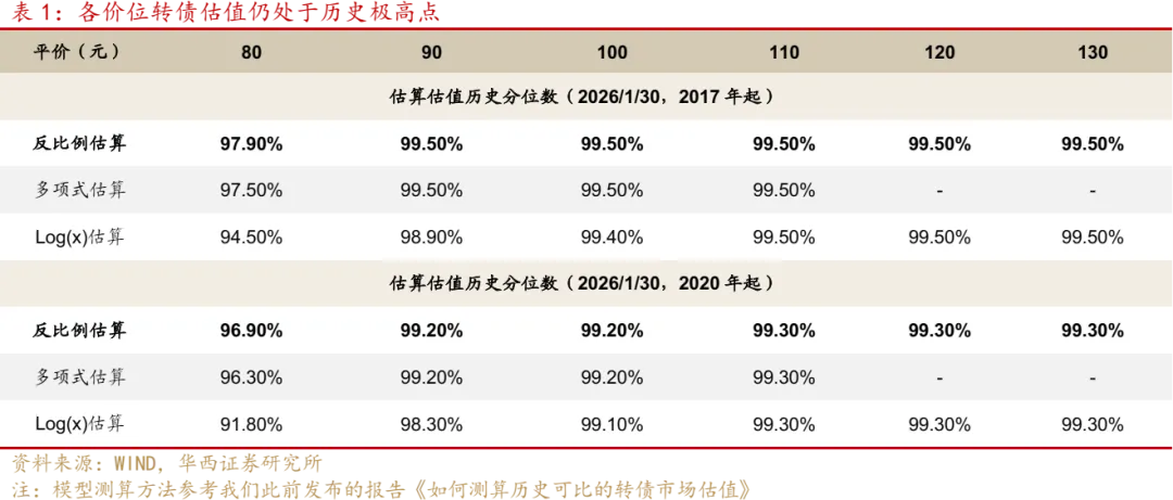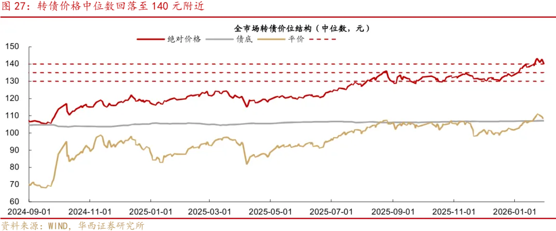 1月,转债估值继续上升,偏股型转债估值拉伸幅度较大。1月上旬,正股行情加速上涨,偏股型转债估值大幅拉伸。到了中下旬,随着正股行情趋于震荡,偏债型转债估值有所下降,而偏股型转债估值仍高于上旬水平。截至2026年1月30日,80元平价对应的估值中枢53.75%,较1月23日下降0.69百分点;100元平价对应的估值中枢为39.57%,环比下降1.55个百分点;130元平价对应的估值中枢环比下降2.33个百分点,至26.49%。